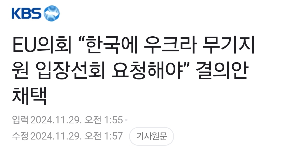 유럽의회가 러시아와 북한의 군사협력을 규탄하면서 한국의 우크라이나 지원을 우회 촉구 (KBS) 본문