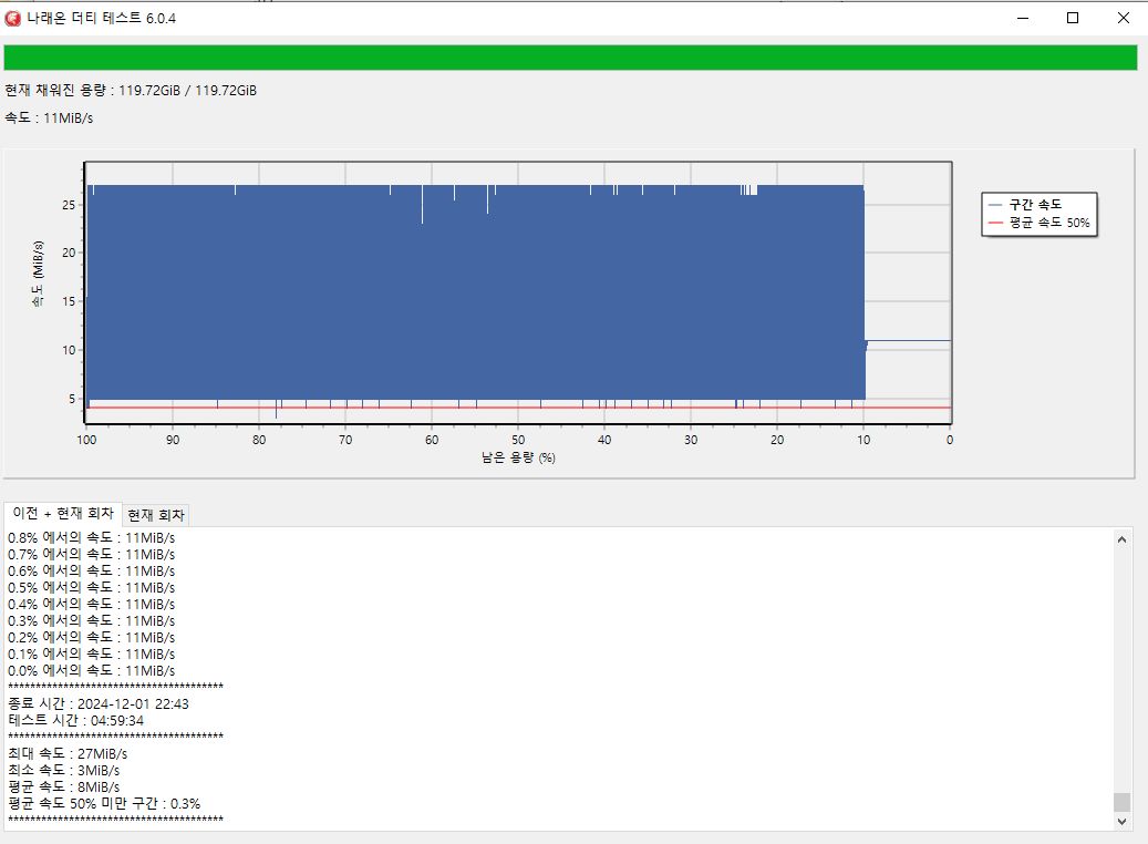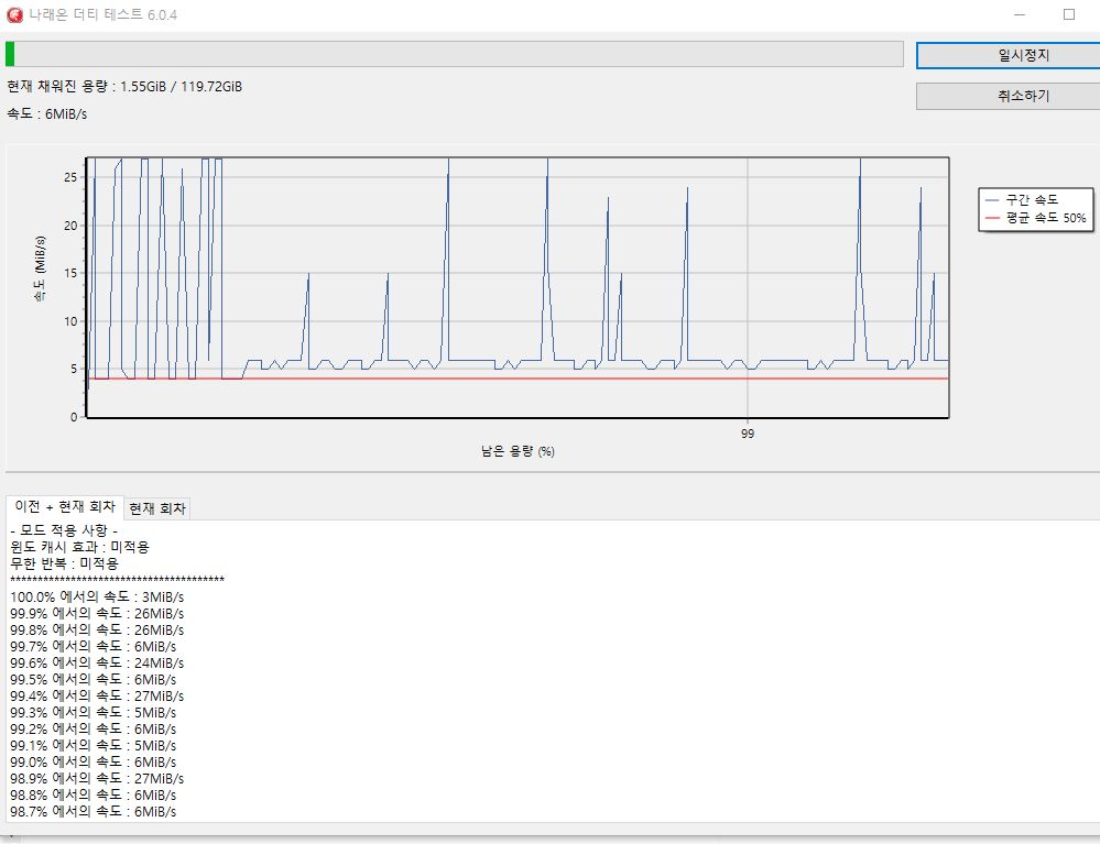 몇 퍼센트 못 가서 ~5MB/s (3.x ~ 11.x 를 오가는데 가장 흔하게 스샷찍히는 것이 5.xx MB/s)