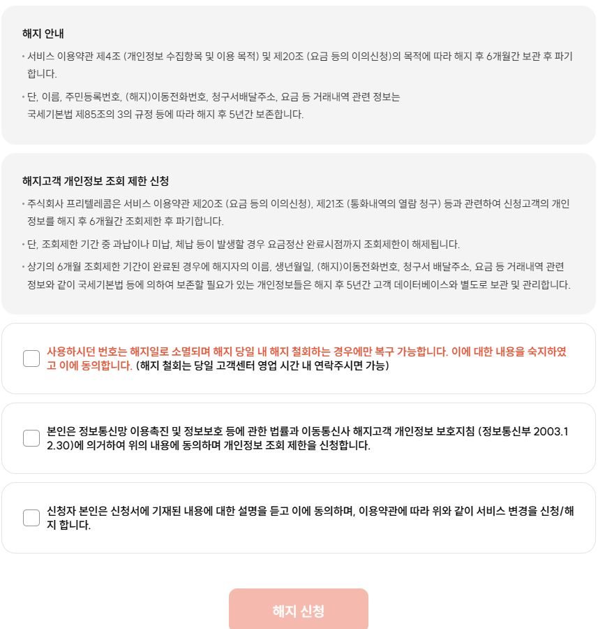 만약 상담원통화까지 해서 해지신청이 처리됐는데, 해지를 취소하고 싶다면 해지 당일만 상담원통화해 가능.