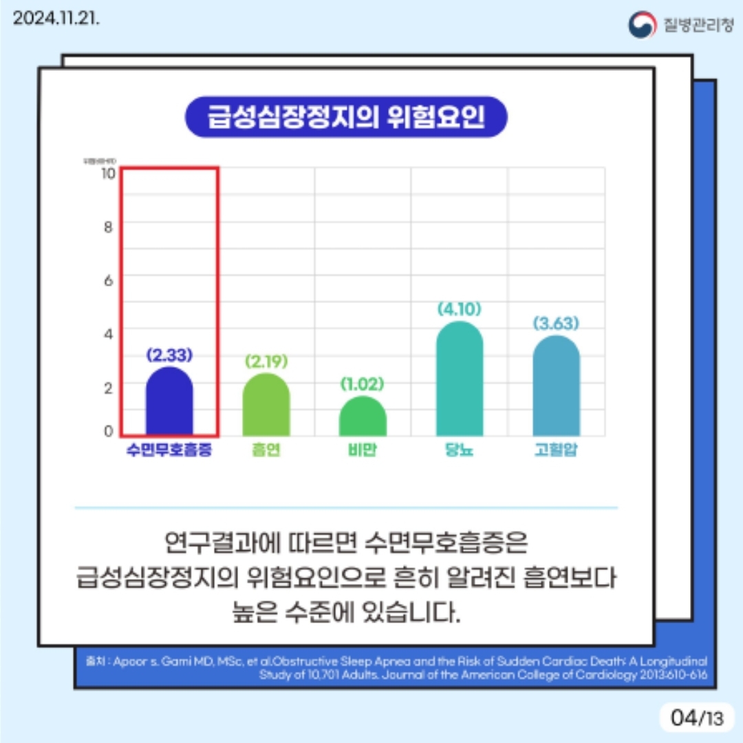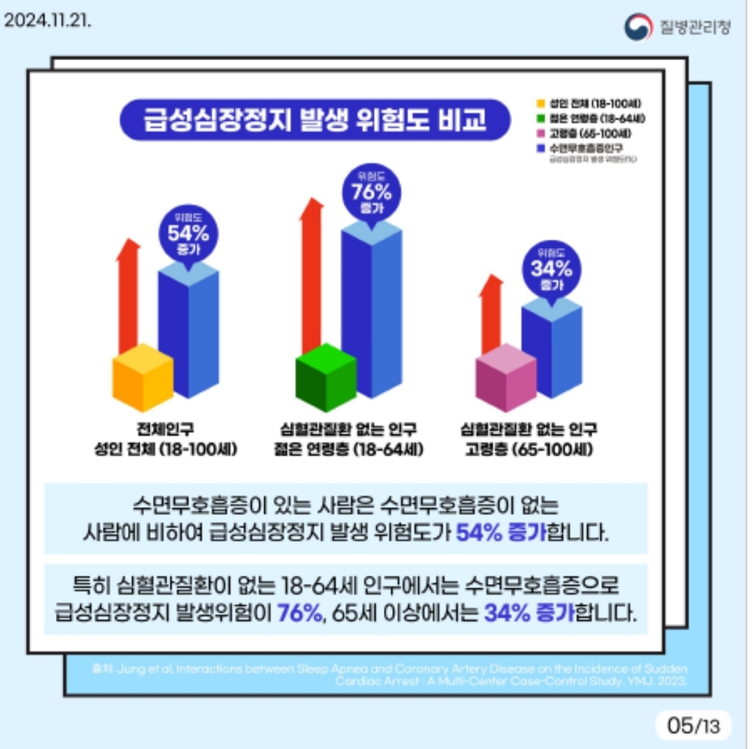 - 수면무호흡증, 급성심장정지의 위험을 높이는 주요 위험 요인으로 발생 위험도 54% 증가