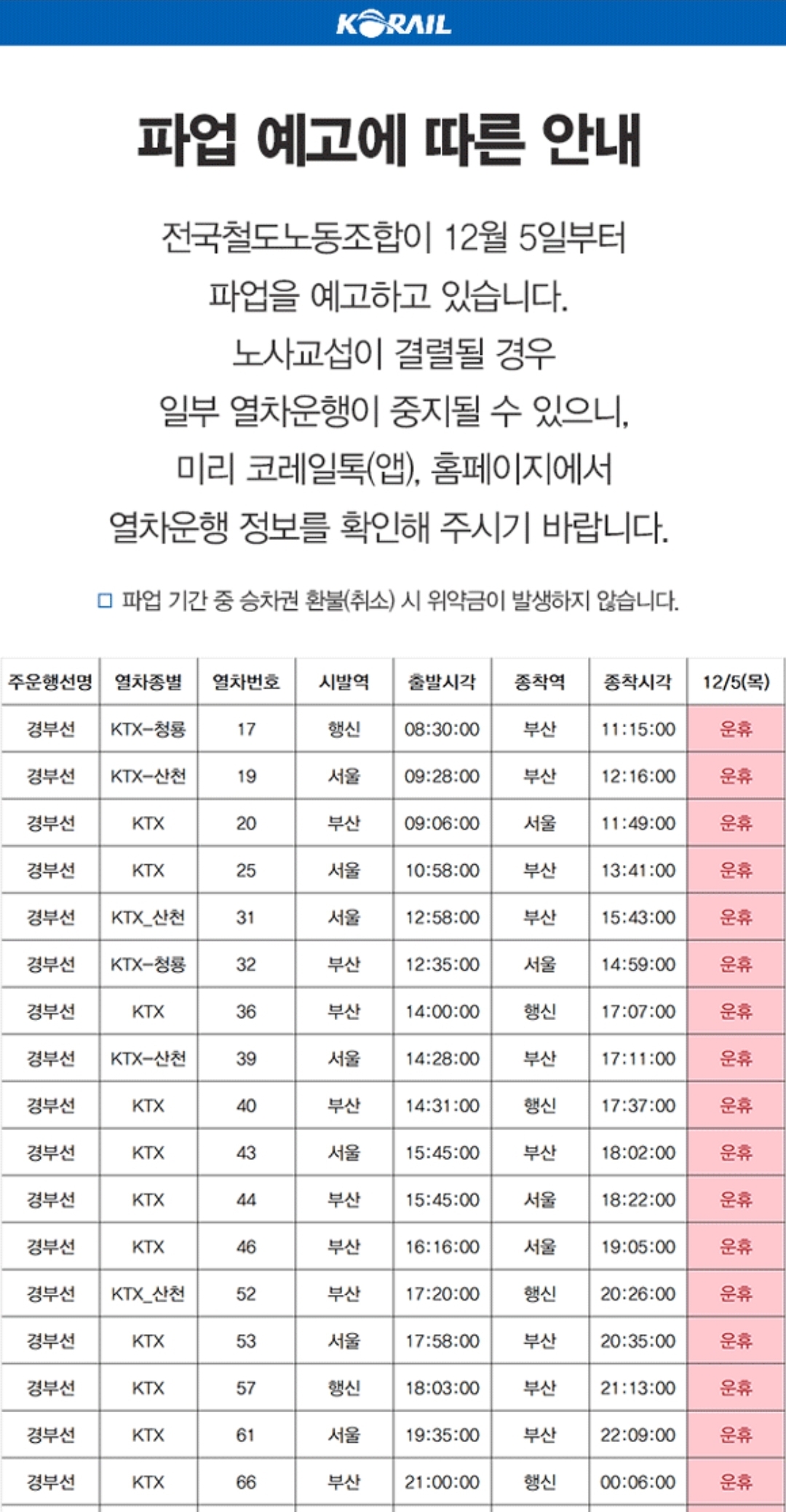 | (코레일) 열차 운휴, 예약 취소: 전국철도노동조합 파업에 따른 안내 (1) | 2024.12.06 |