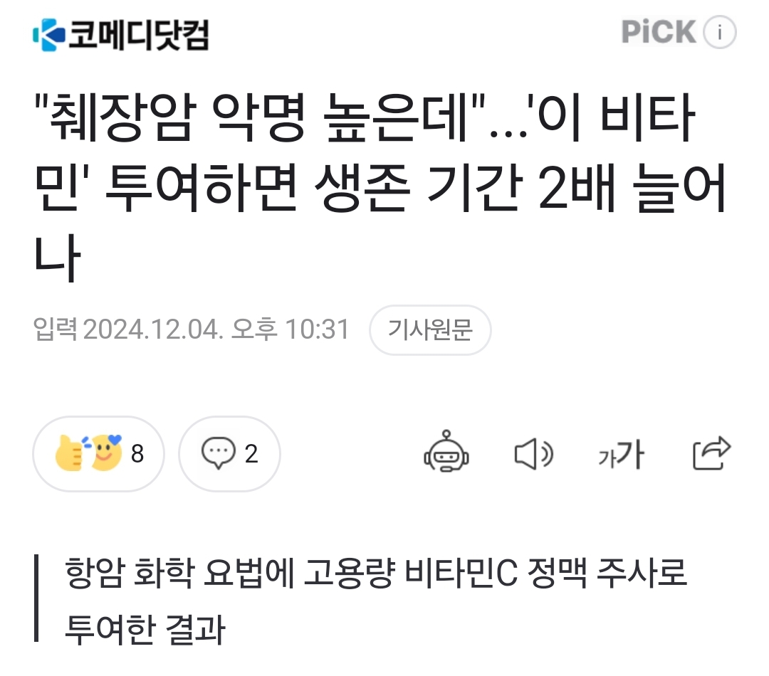 특정 암환자의 특정 항암치료에 고용량 비타민C 를 병용하면 생존기간이 늘어났다는 연구 본문