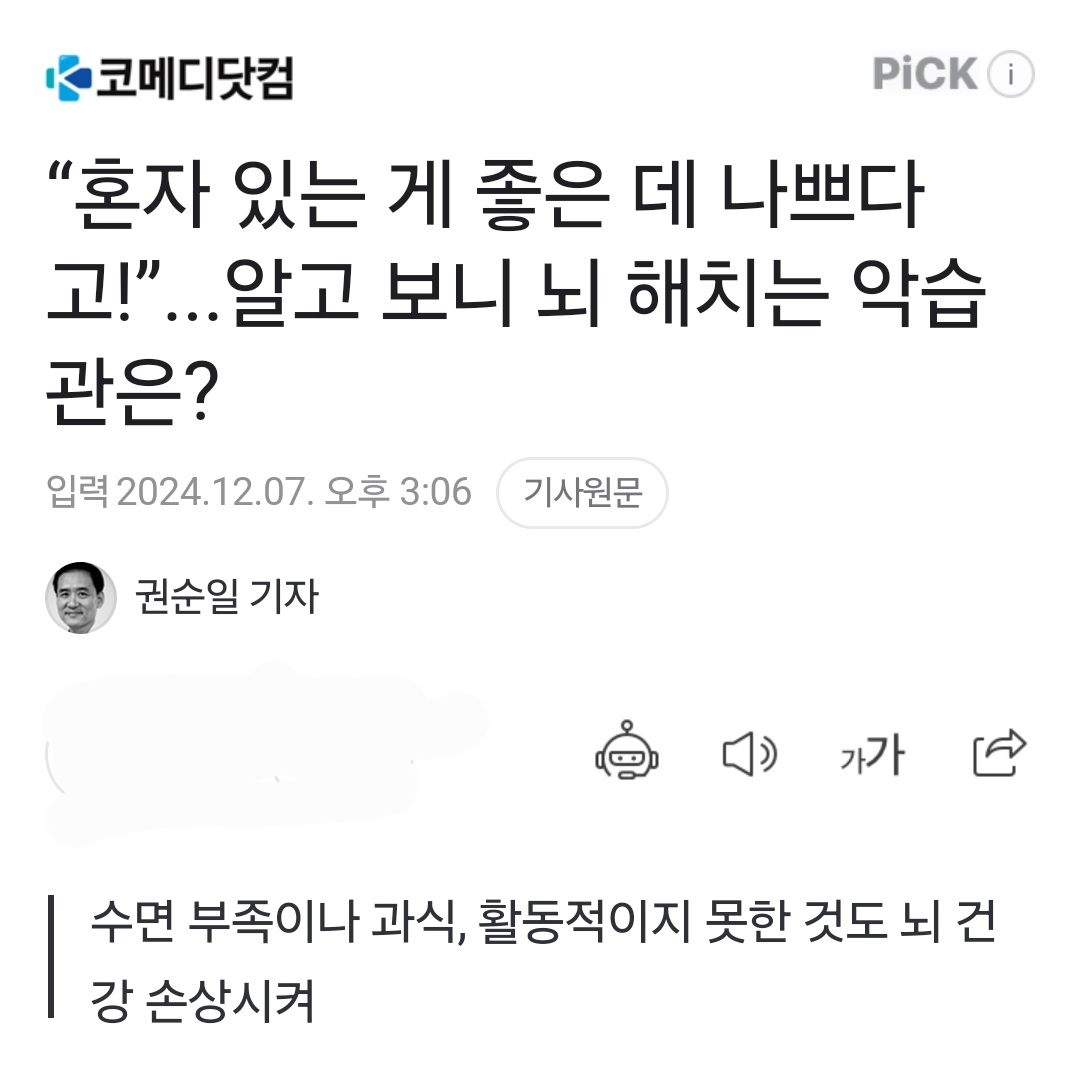 “혼자 있는 게 좋은 데 나쁘다고!”...알고 보니 뇌 해치는 악습관은? - 코메디닷컴 2024.12.