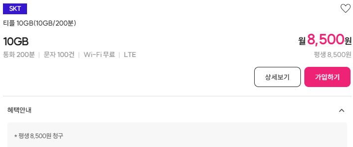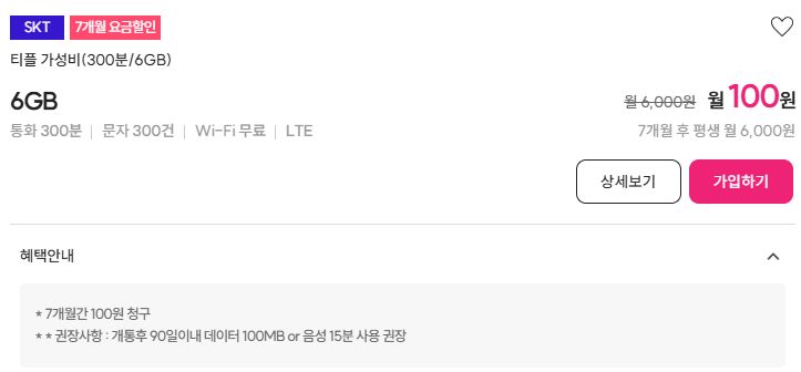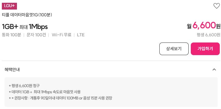 마지막은 통화문자는 100건씩만 주지만, 1Mbps QoS가 붙어서 월 6600원이란 점이 특색있는 요금제.
