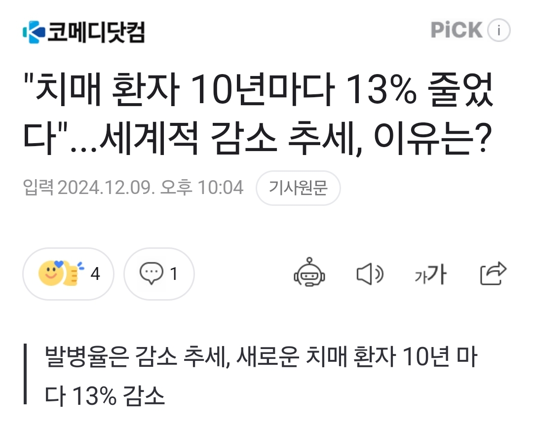 (......) "지난 30년간 발병률이 꾸준히 감소한 것은 생활 습관 교육과 혈압 조절, 항혈전제 약물 복용과 같은 건강 개입을 통한 예방적 노력이 평균 수명의 증가로 인한 치매 부담 증가를 최소한 일부 상쇄할 수 있음을 시사한다" (......)