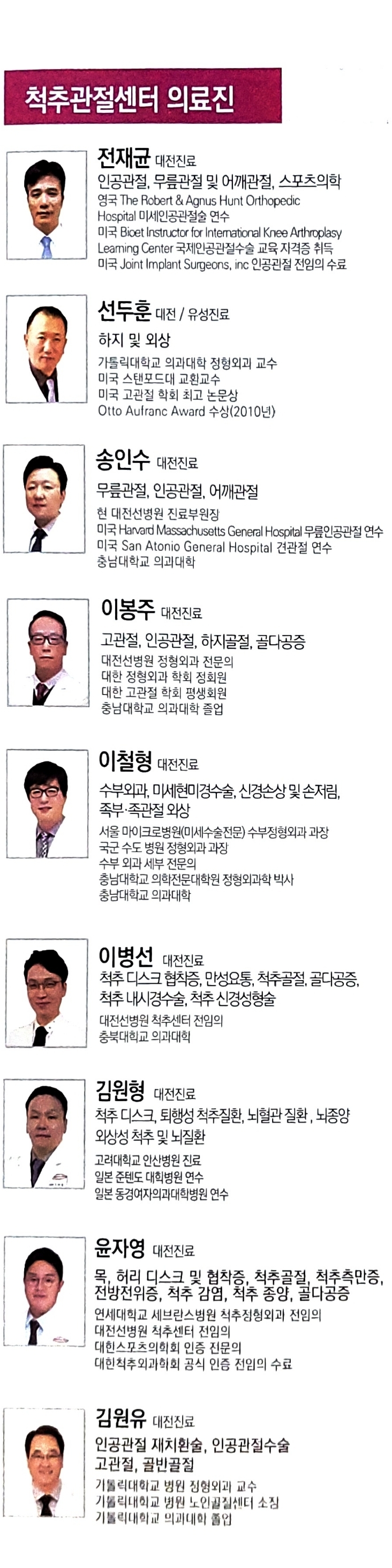 소개된 의료진 중 한 사람은 저의 가족이 잘 치료받았는데 실력좋은 분. 원래 진료기록이 충남대병원에 있었지만, 의료파업때문에 의뢰서받아가도 진료과가 다르면 안 받아준다고 해서 선병원에 갔는데 다행이 잘 됐습니다.