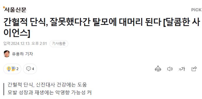中 연구팀 "건강에 좋은 간헐적 단식, 의도치 않은 부작용 가능성" 간헐적 단식이 신진대사 건강에는 좋지만 생쥐 실험에서는 털의 성장을 억제하는 것으로 나타났다. 사람 대상 소규모 임상시