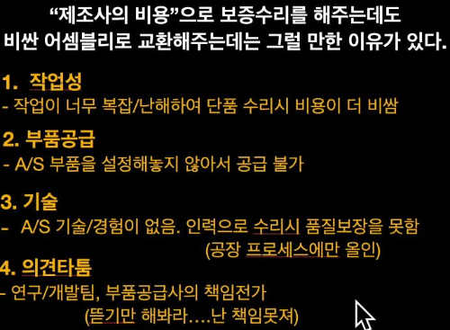 전기차회사들이 모터나 베터리 어쎔블리Ass'y를 보증기간 내 통째로 교환해주는 제품보증을 하는 이유? 여러 이유로 분해수리가 불가능하거나 거의 안 되는 방식으로 생산하기 때문. (스마트폰의 사설수리권리와는 다르게, 아직은 산업공학적인 미성숙 문제가 더 큰 듯)