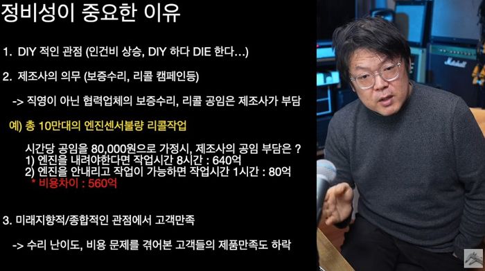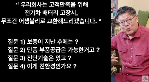 플라스틱쪼가리 하나때문에 모듈 전체를 교환하도록 만드는 게 친환경인가요? 전기차회사들은 백년 넌게 진화해온 내연기관 자동차의 부품유통과 표준화, 좋은 정비성을 본받아야 합니다... 이런 이야기.
