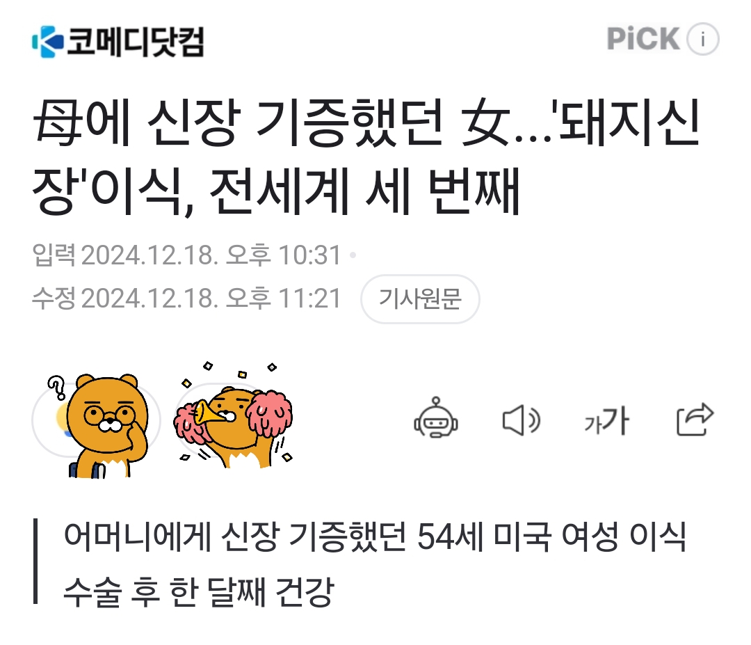 母에 신장 기증했던 女...'돼지신장'이식, 전세계 세 번째