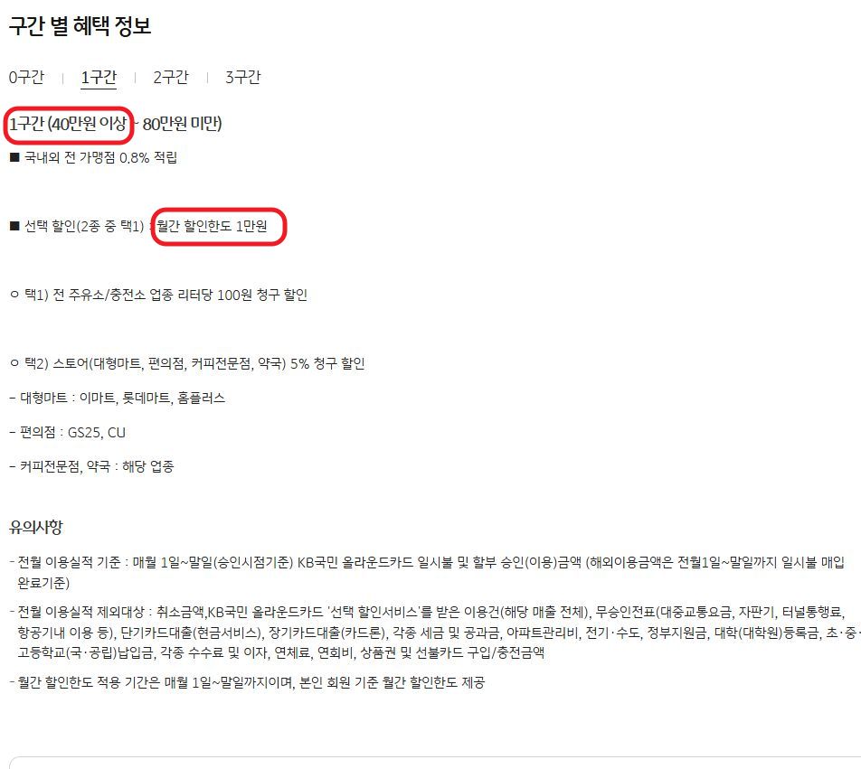 월 실결제 40만원부터 5% 청구할인혜택(월 40~80만원 사이 결제일 때, 월한도 1만원) 이 시작되는 것에 주의.