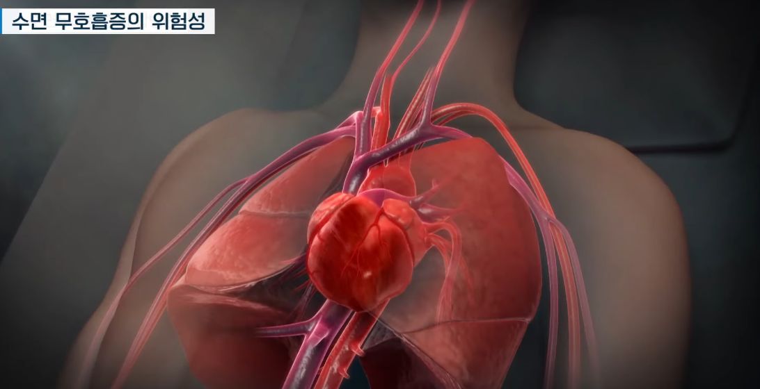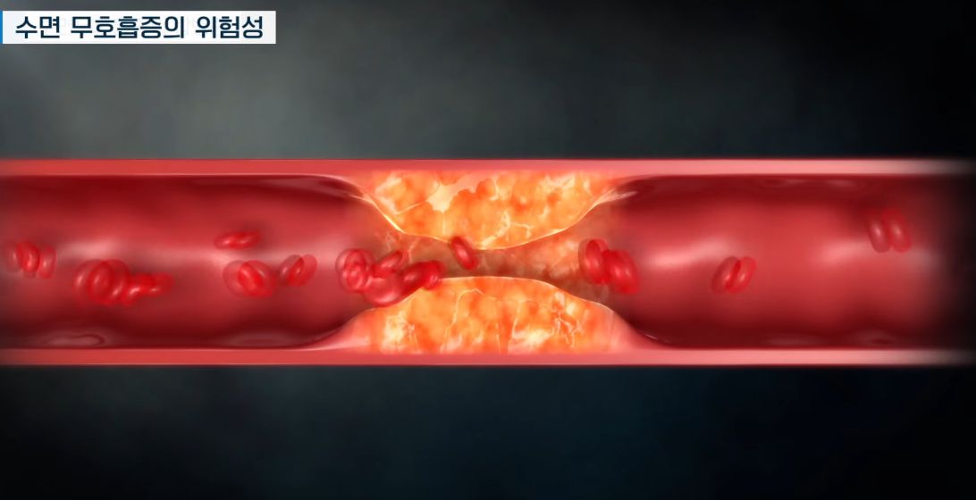 수면무호흡증 -> 혈중산소 저하 / 뇌의 저산소증 -> 교감신경계흥분 -> 심장박동 강화 - > (뇌로 피를 보내기 위해) 온몸혈관 수축 -> 박동의 불규칙성과 혈관수축으로 혈관벽 손상, 혈전 악화 -> 심근경색, 뇌줄중 위험 증가.