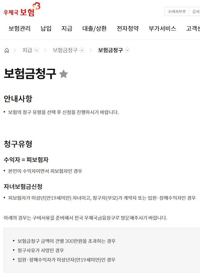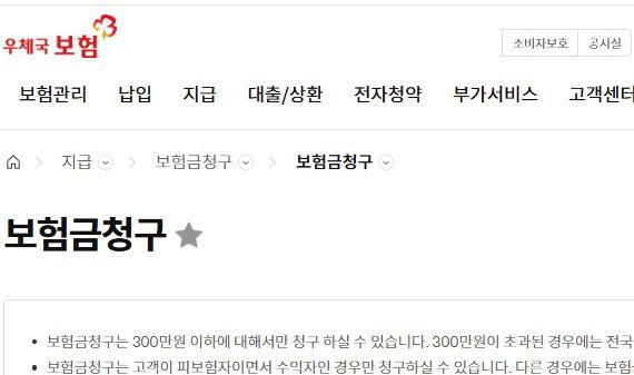 ㅡ 보험금청구는 300만원 이하에 대해서만 청구 하실 수 있습니다. 300만원이 초과된 경우에는 전국 우체국금융 창구로 방문해주시기 바랍니다.