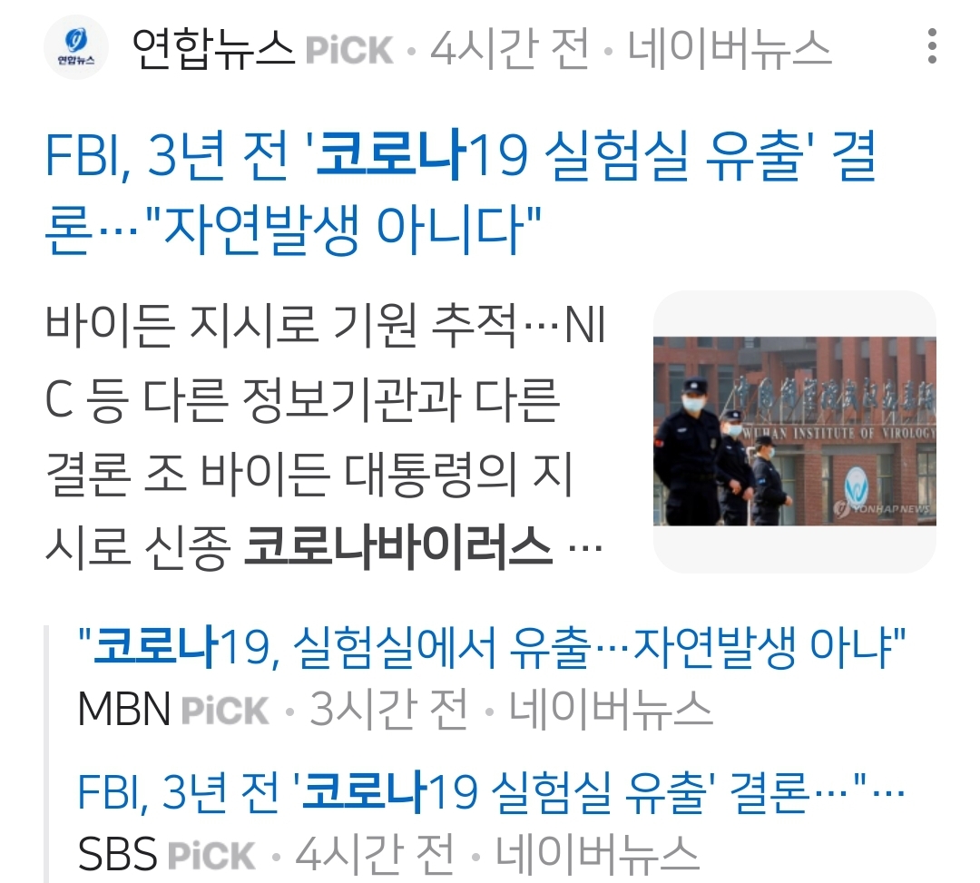 바이든 지시로 기원 추적…NIC 등 다른 정보기관과 다른 결론 조 바이든 대통령의 지시로 신종 코로나바이러스 감염증(코로나19)의 기원을 추적한 연방수사국(FBI)이 바이러스가 실험실에서 인위