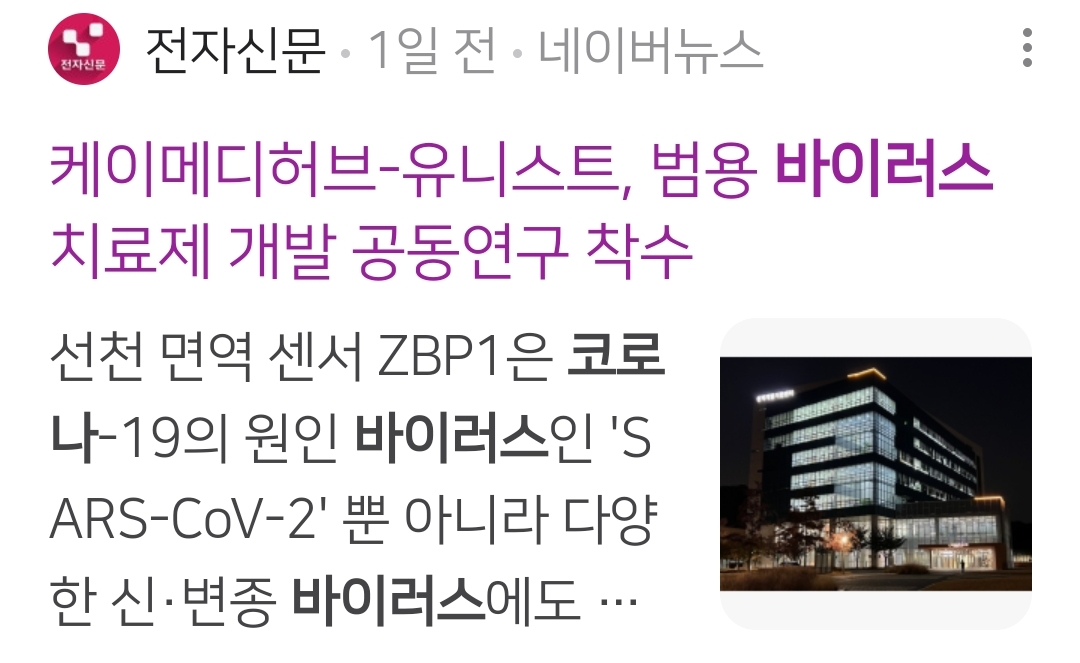 케이메디허브(대구경북첨단의료산업진흥재단) 신약개발지원센터가 울산과학기술원( UNIST)과 공동으로 선천 면역 제어를 통한 범용 바이러스 치료제 개발에 나선다. 케이메디허브 신약개발지원