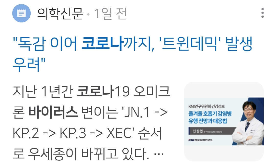 모두 기존 면역을 크게 회피하는 변이가 아니기 때문에 지금 국내에서 접종되고 있는 JN.1 기반 코로나19 백신이 충분한 예방효과가 있으며, 지난해보다 올해 고위험군 접종률이 더 높은 것으로 알려졌다. 또한, 지난 여름 비교적 큰 유행이 지나갔기 때문에 길게는 6개월 정도 유지되는 자연 면역에 의한 유행 억제력도 아직 다소 남아 있어, 코로나19는 당장 유행하기보다는 이번 독감 유행이 정점을 지난 후 순차적으로 유행할 전망이다. 실제로 최근 3년간 독감과 코로나19는 동시 유행보다는 시차를 두고 유행하는 경향을 보이고 있다.