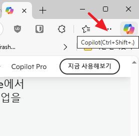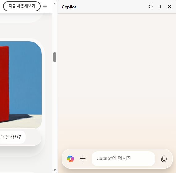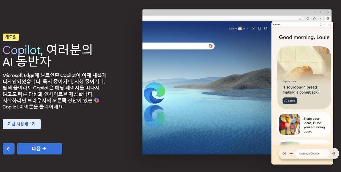브라우저 오른쪽에 코파일럿 채팅창을 호출하는 버튼이 생겼군요.