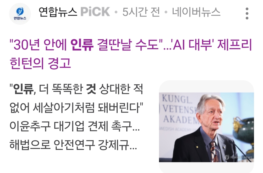 이 사람은, 노벨 물리학상 수상자며, 구글 부사장까지 지냈고, 지금은 캐나다 토론토대 교수. AI의 대부라고 기사에서는 덧붙임. 저 발언은, 스웨덴 스톡홀름 왕립과학한림원에서 열린 2024 노벨경제학상·화학상·물리학상 수상자 공동 기자회견에서 나온 말이라는 듯.
