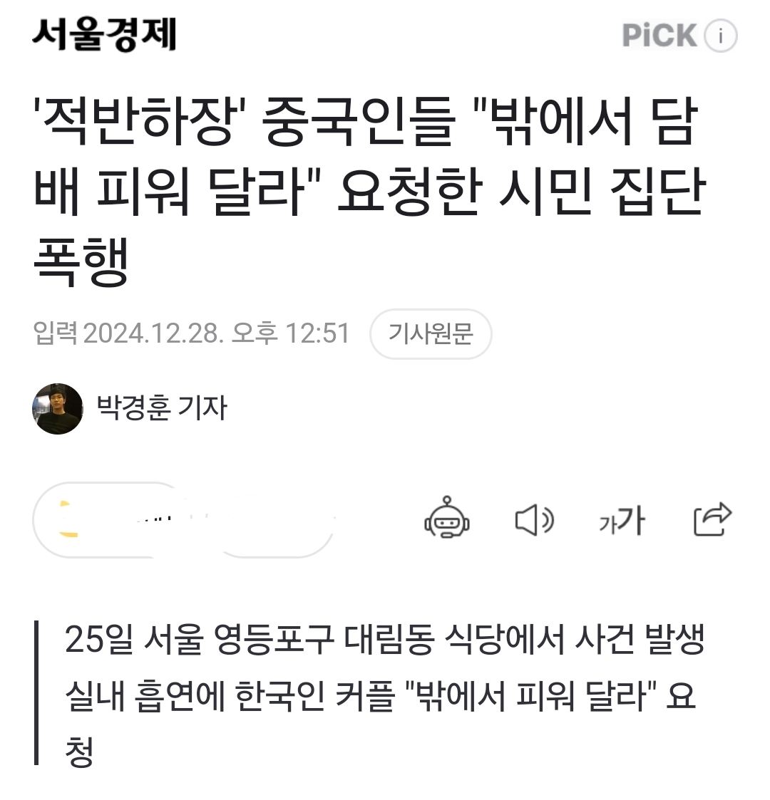 실내 흡연을 지적한다는 이유로 중국인 무리가 시민에게 집단 폭행을 가한 사건이 발생했다.