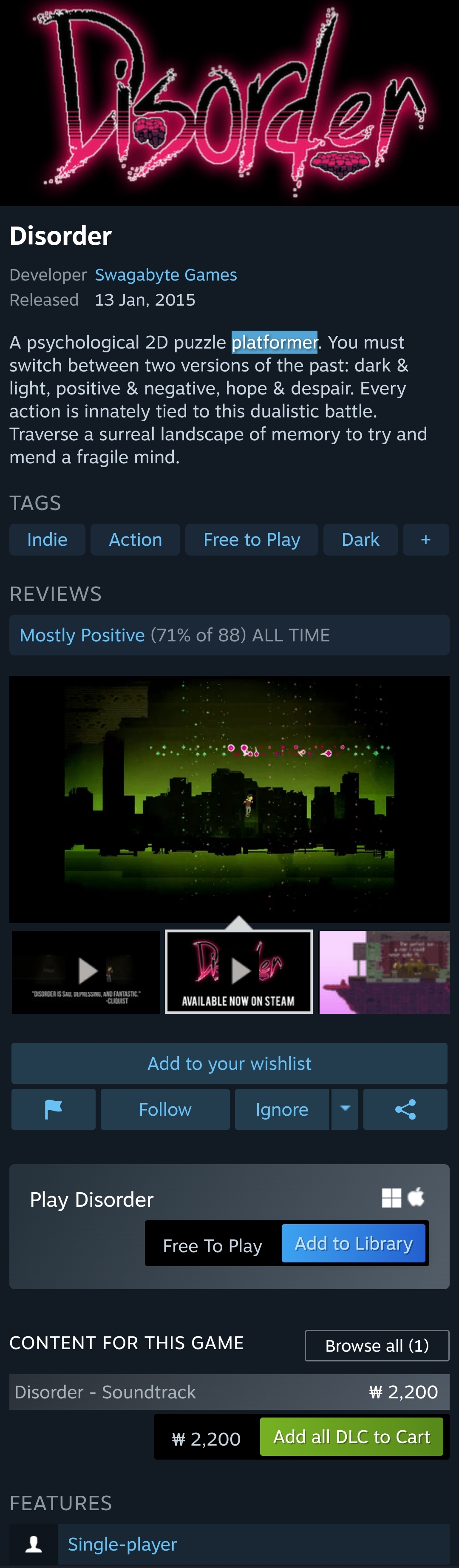 A psychological 2D puzzle platformer. You must switch between two versions of the past: dark & light, positive & negative, hope & despair. Every action is innately tied to this dualistic battle. Traverse a surreal landscape of memory to try and mend a frag