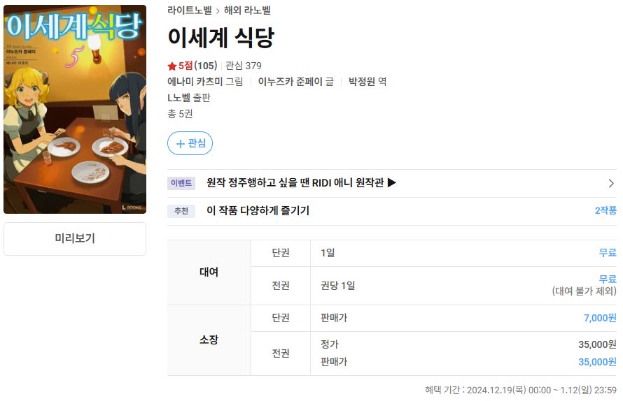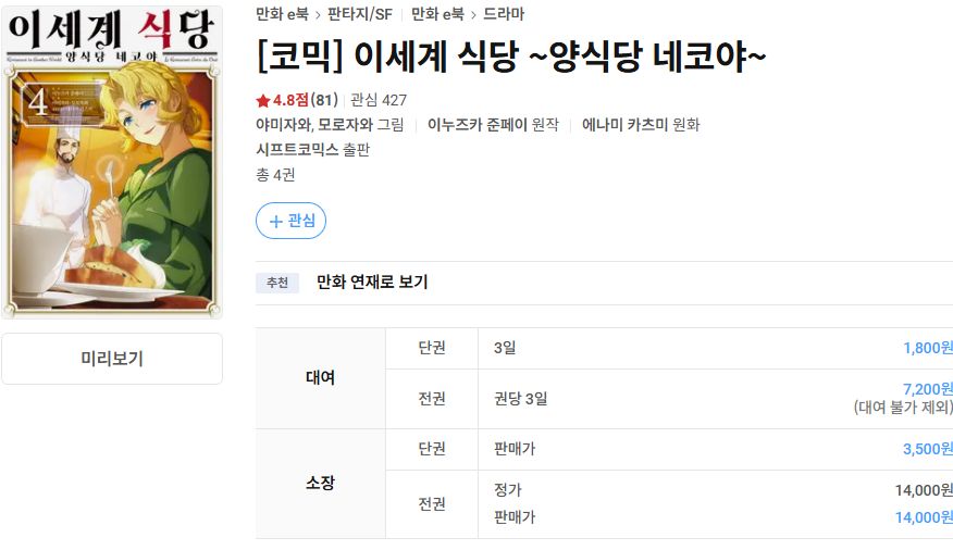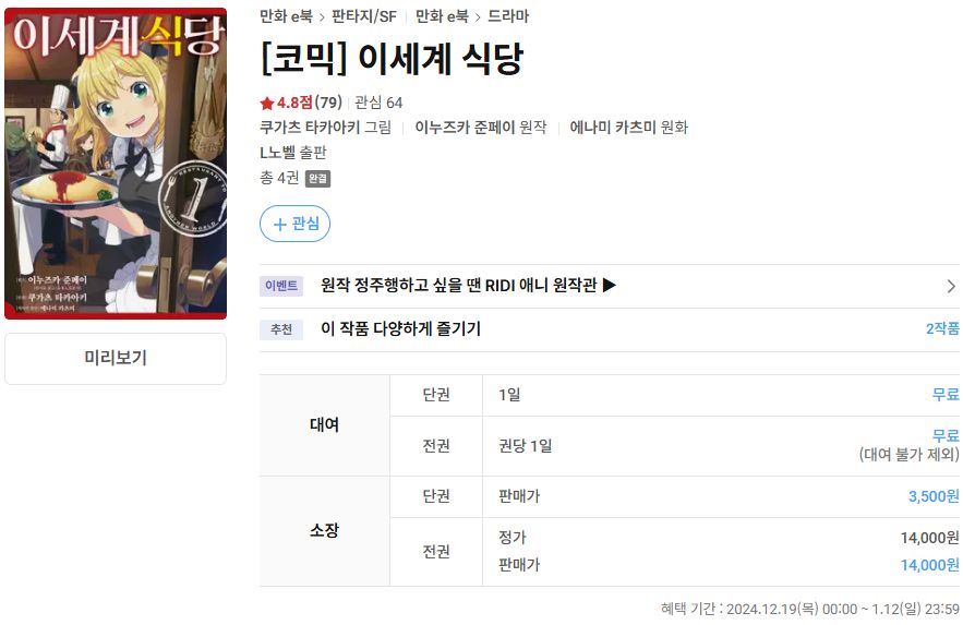 이세계 식당 시리즈 라이트노벨, 코믹스: 1권 or 체험판 무료 맛보기 (리디북스) 본문
