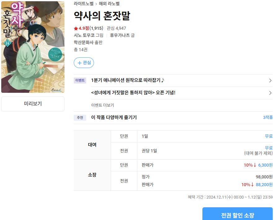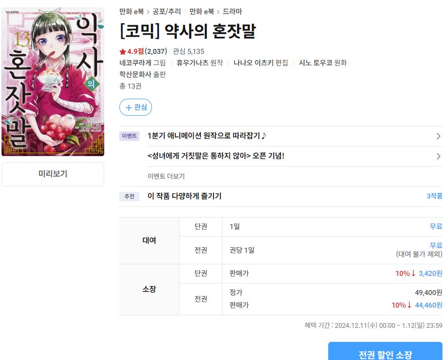 | 책벌레의 하극상 (라이트노벨, 코믹스) 각 1권 맛보기 (리디북스) (0) | 2025.01.08 |
