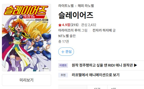 슬레이어즈 작품소개: 누계 2천만 부, 역대 최고의 라이트노벨전설이 된 그들이 돌아왔다수많은 마법을 다룰 수 있는 천재 마도사이자 전사, 게다가 귀엽기까지(?!)한 소녀, 리나 인버스.방랑 여