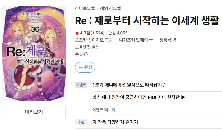 Re: 제로부터 시작하는 이세계 생활 (라이트노벨, 코믹스) 첫 권 1일 무료대여 맛보기(리디북스) 본문