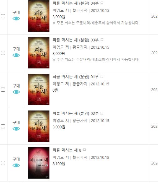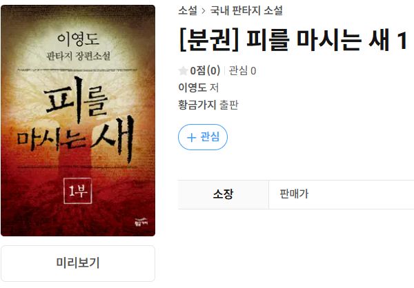이 작품의 전작(프리퀄)이 되는 "눈을 마시는 새"도 전자책으로 올라와 있습니다. 그건 챕터당 1권씩 총 18권으로 분책돼있는데, 권당 2천원이고 1권은 0원입니다.