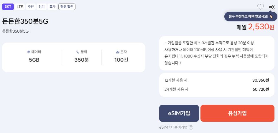 프리티) 든든한350분5G (5기가, 350분, 100건) 2530원