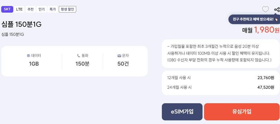 프리티) 심플 150분1G (1기가, 150분, 50건) 1980원