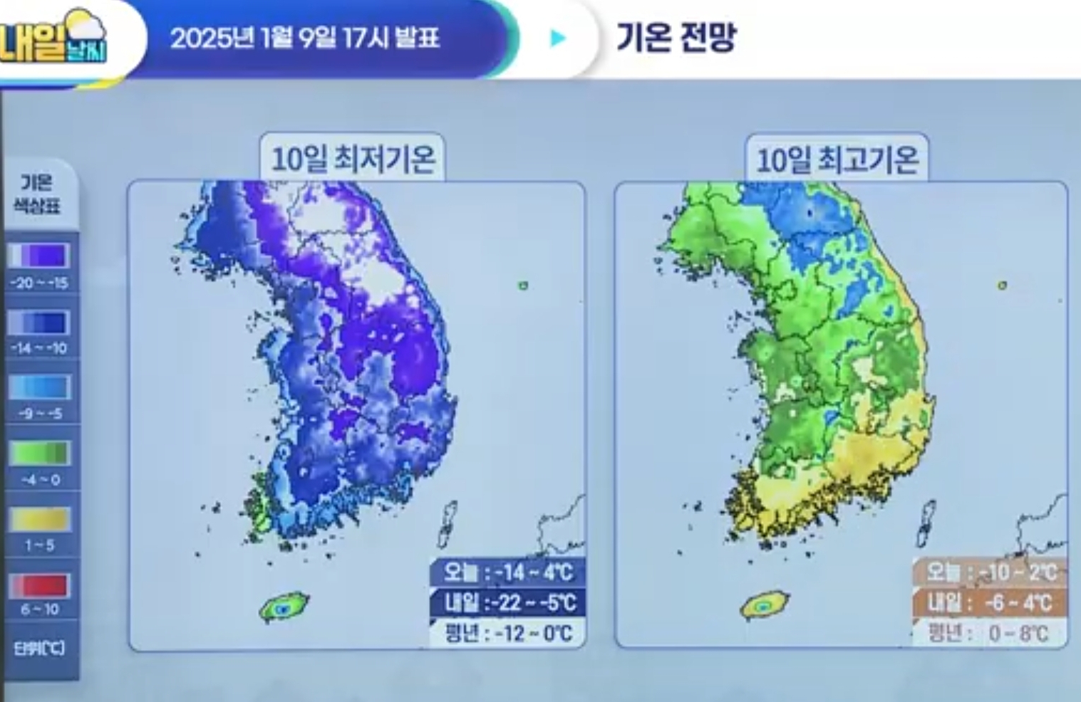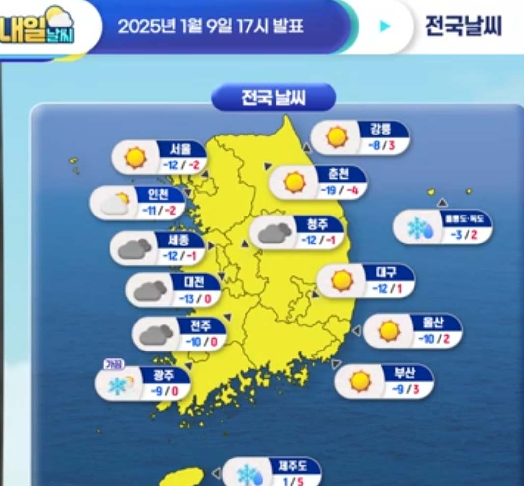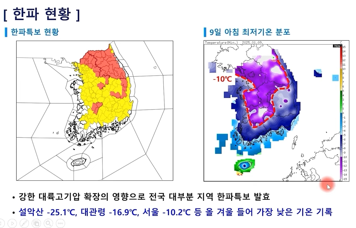 남부지방마저 강추위! 부산 영하 9도, 광주 영하9도 (25년 1월 9일 기상청 예보브리핑)