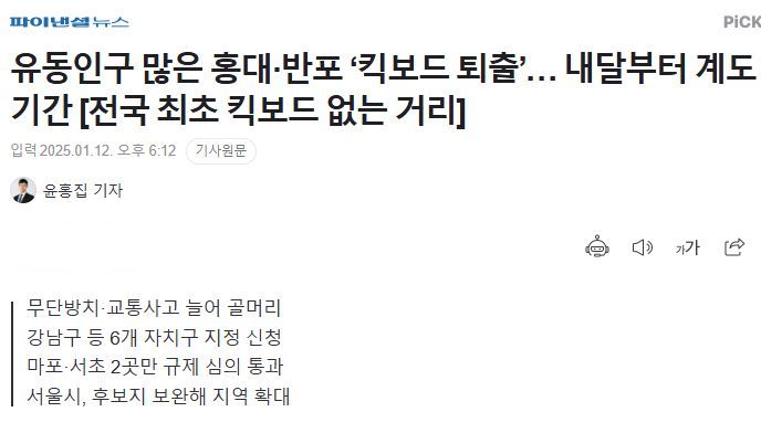 앞으로 서울 마포구 홍대 일대와 서초구 반포 학원가에서 킥보드 통행이 금지된다. 두 지역이 전국 처음으로 '킥보드 없는 거리'로 지정됐다. 서울시는 당초 시내 5~6곳을 킥보드 없는 거리로 추