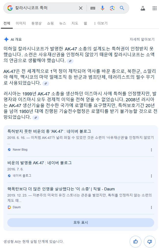 구글검색엔진에서 칼라시니코프 특허라고 치면