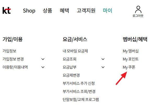 kt.com 에 로그인해서, "마이" 메뉴에서 펼쳐지는 서브메뉴 중, 멤버십/혜택 > My 쿠폰.