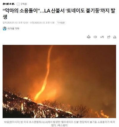 미 서부 최대 도시 로스앤젤레스(LA)에서 동시 다발한 산불이 며칠째 계속되는 가운데, 보기 드문 ‘불 토네이도’까지 발생했다. 11일(현지 시각) 미국 폭스웨더 등에 따르면, 전날 밤 LA 서부 해