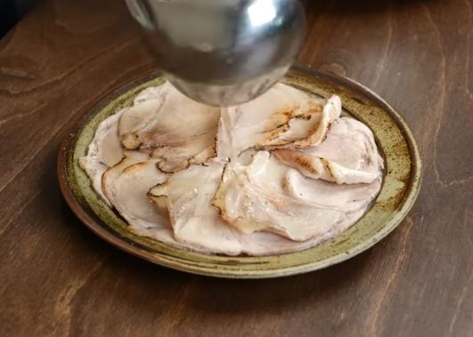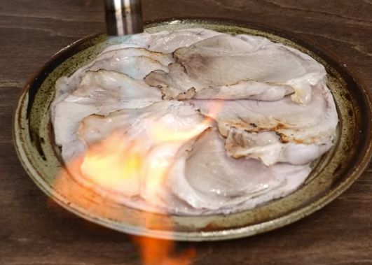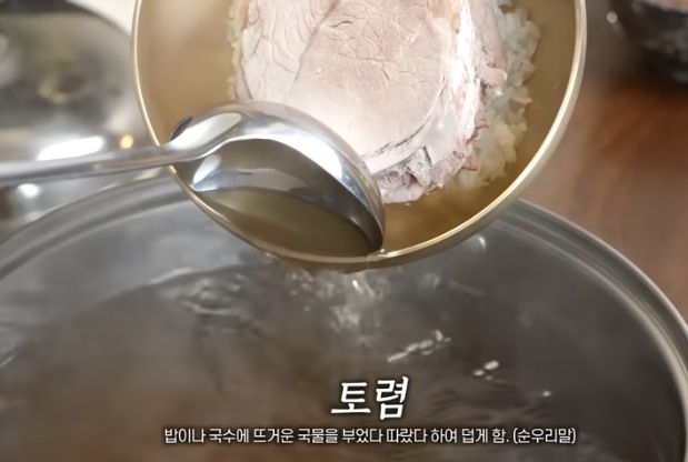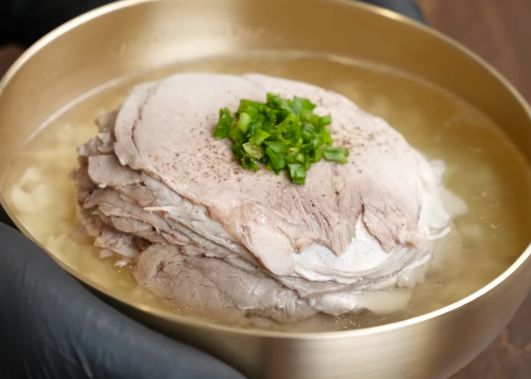 ㅡ 수육은 저 고기를 진열하고 토치로 불맛 모양을 내고, 그리고 국물을 얹기.