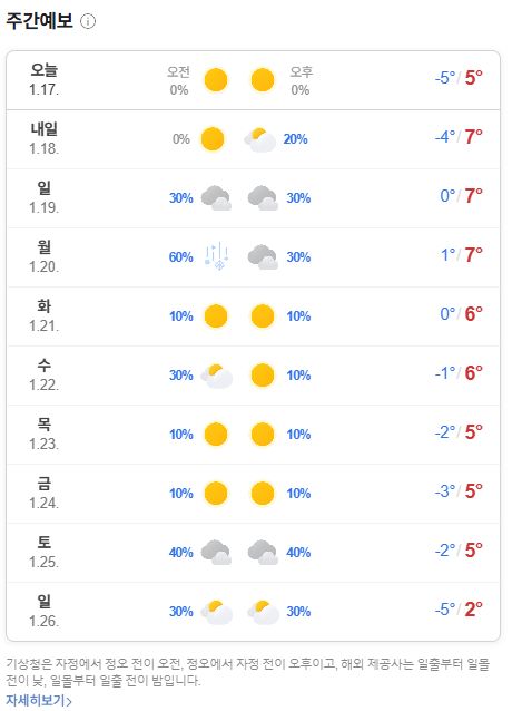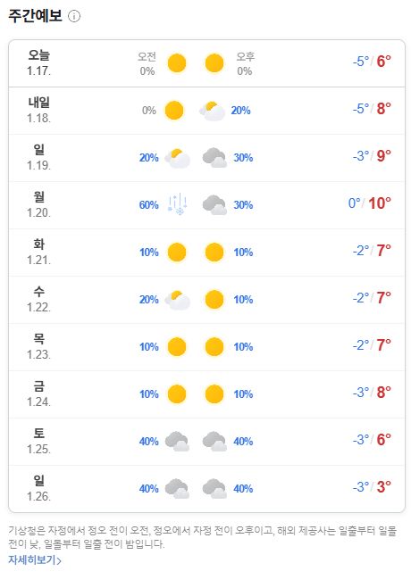 2025.1.17.금.~1.26.일.일기예보: 내주부터는 아침최저기온 -3도 내외, 낮최고기온 5도 이상인 날씨. 이번주보다는 다음주가 따뜻. 본문