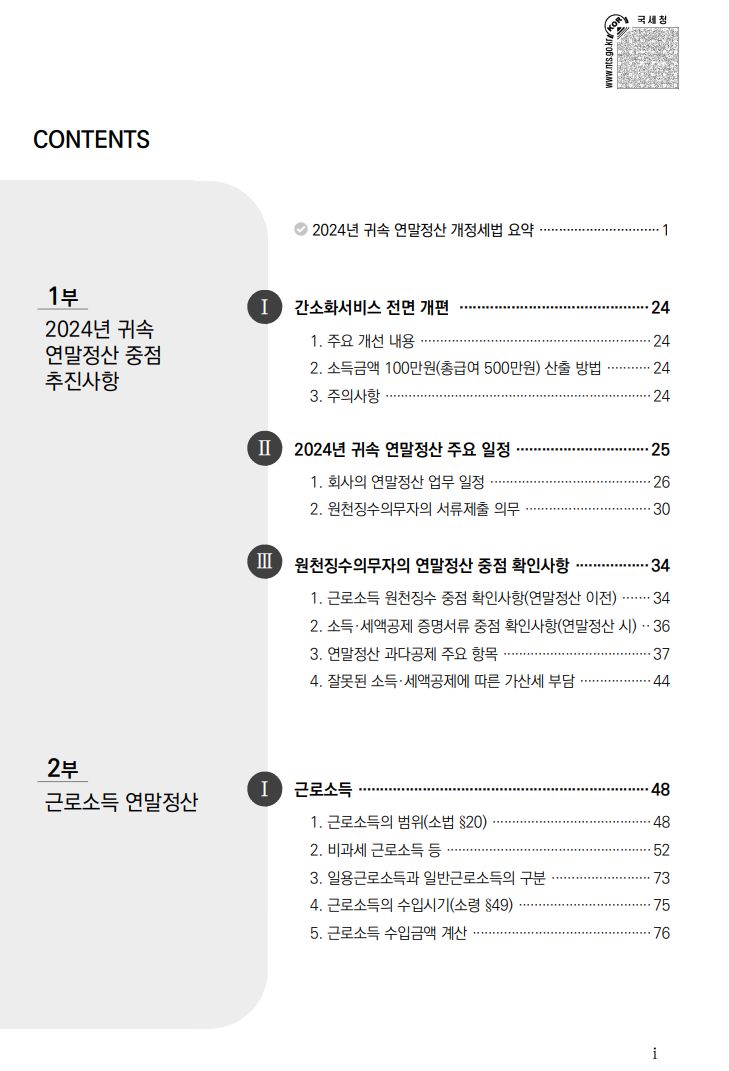 책자 차례: 2024년 귀속 연말정산 중점 추진사항,