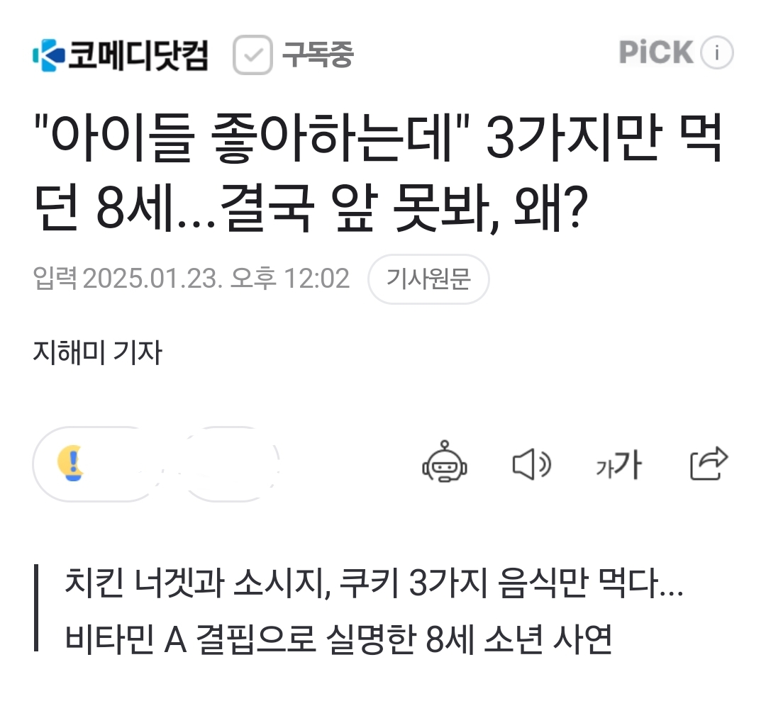 "아이들 좋아하는데" 3가지만 먹던 8세...결국 앞 못봐, 왜?