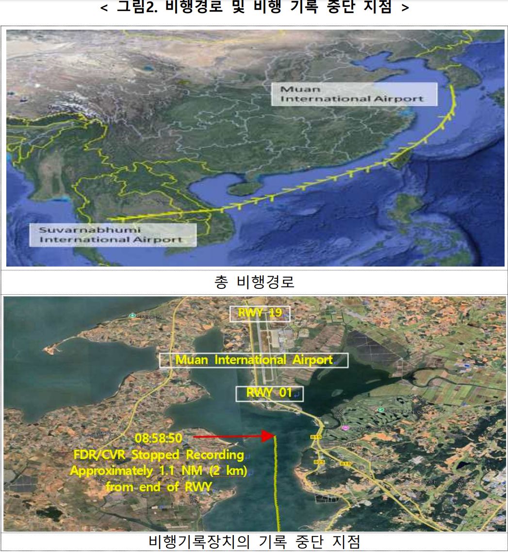 ㅡ 항공기가 활주로 남단에서 약 2km 거리까지 접근했을 때, 08:58:50초에 항공기에 장착된 비행자료기록장치(FDR)와 조종실음성기록장치(CVR)의 기록은 동시에 중단되었다.