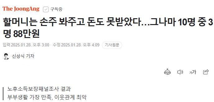 국민연금공단 산하 국민연금연구원의 국민노후소득보장패널조사에서 이렇게 나왔다. 2023년 8~11월 전국 50대 이상 패널 8736명을 조사한 것이다. 패널 조사는 반복해서 면접하는 여론 조사의 한 방식이다. 같은 대상자(패널)에게 같은 질문을 반복해 의견이 어떻게 변했는지 따진다. (......) - 위 기사
