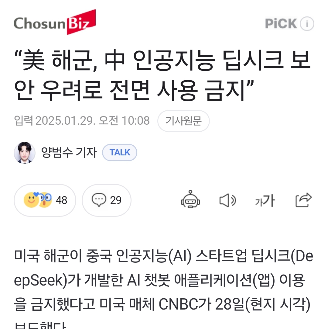 미국 해군이 중국 인공지능(AI) 스타트업 딥시크(DeepSeek)가 개발한 AI 챗봇 애플리케이션(앱) 이용을 금지했다고 미국 매체 CNBC가 28일(현지 시각) 보도했다. 보도에 따르면 미 해군은 지난 24일 전