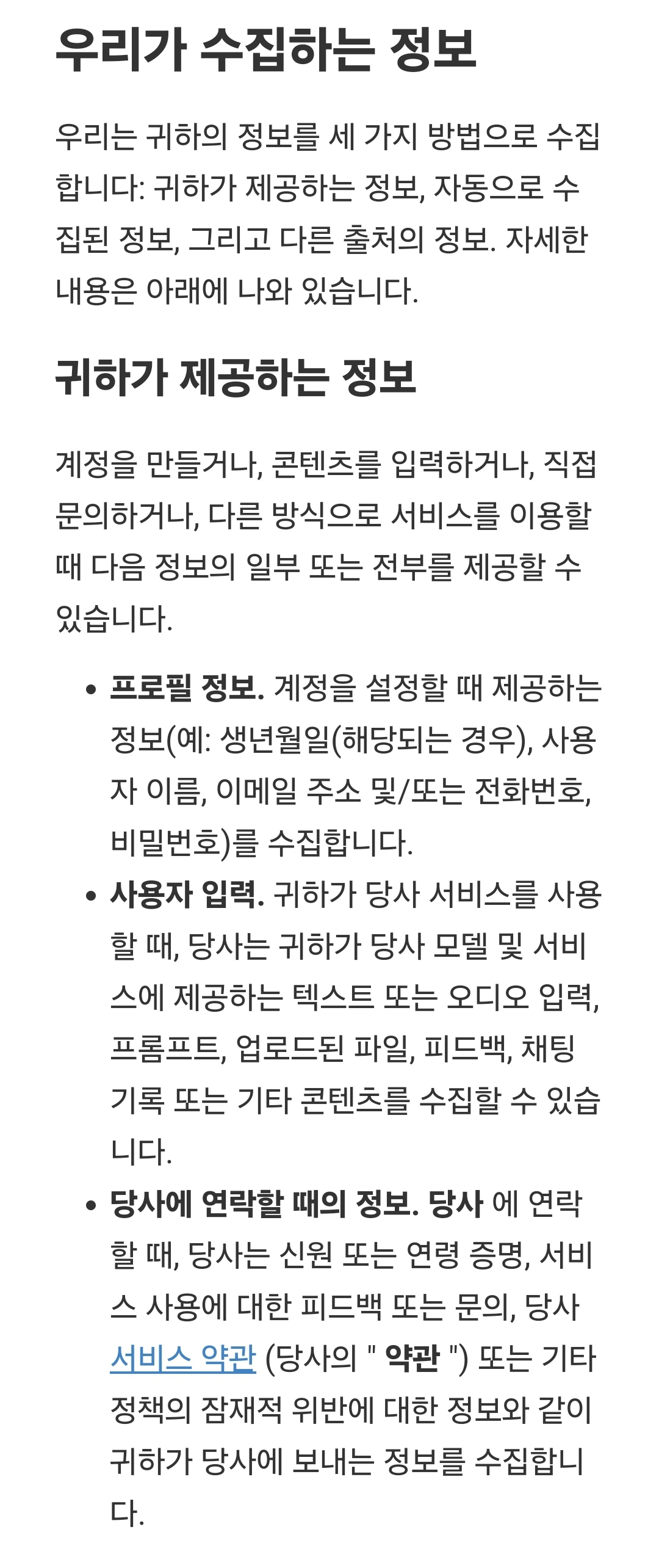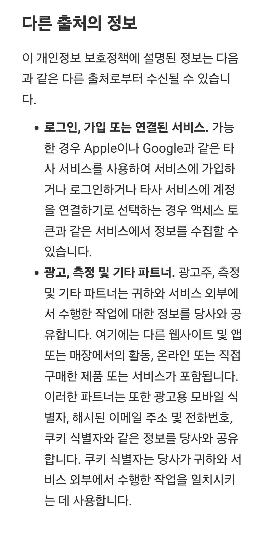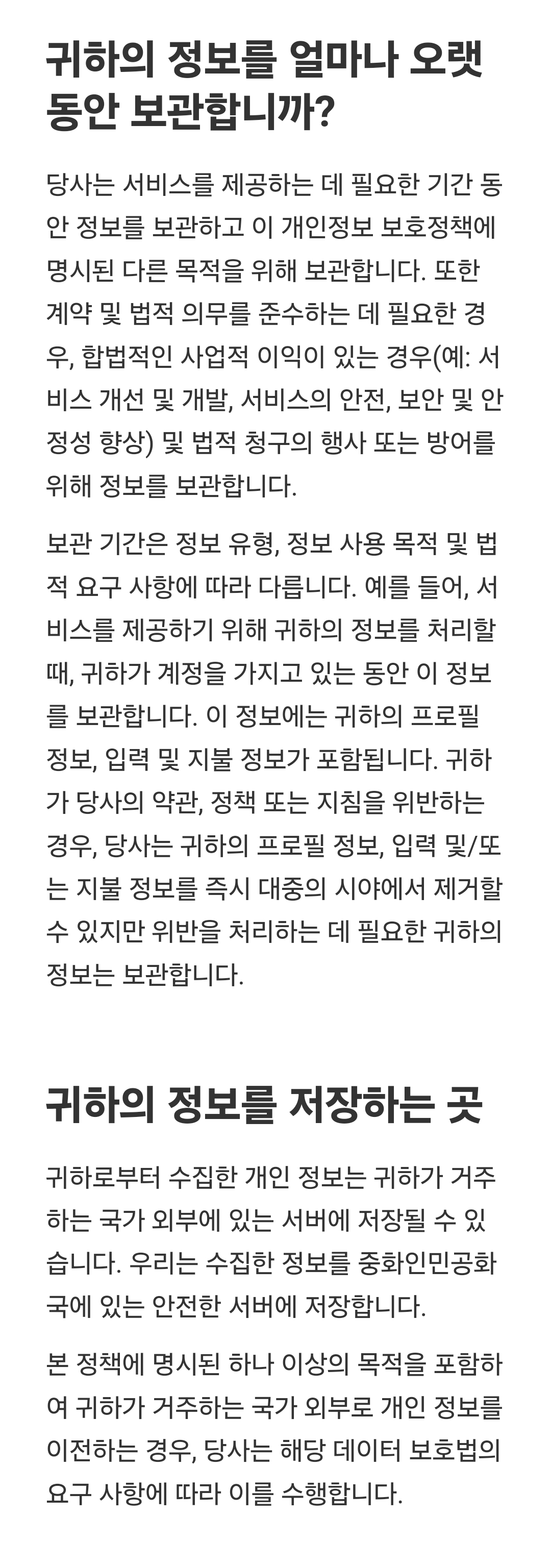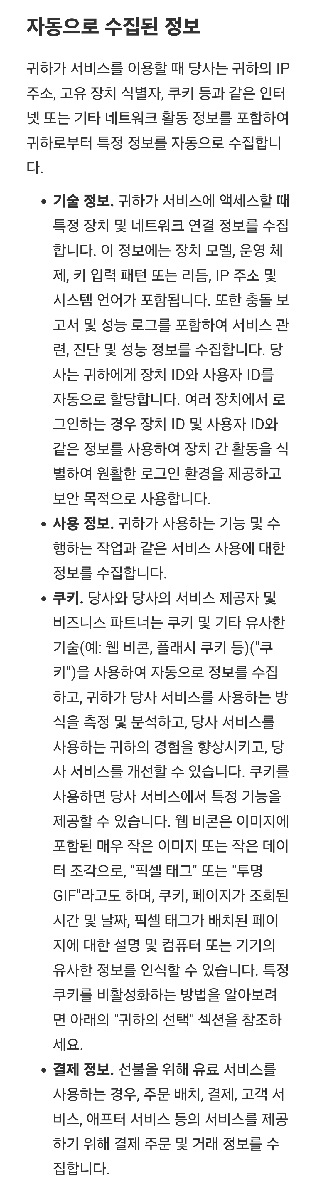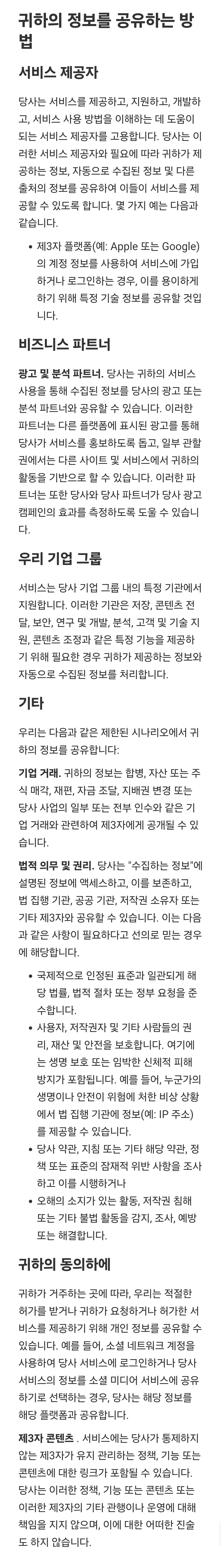 두 가지 링크 중, 개인정보처리부분 링크를 터치하면, 영문으로 된 긴 웹페이지가 나오는데, 웹브라우저 기계번역을 돌려보면 대충 이렇습니다. 일부만.