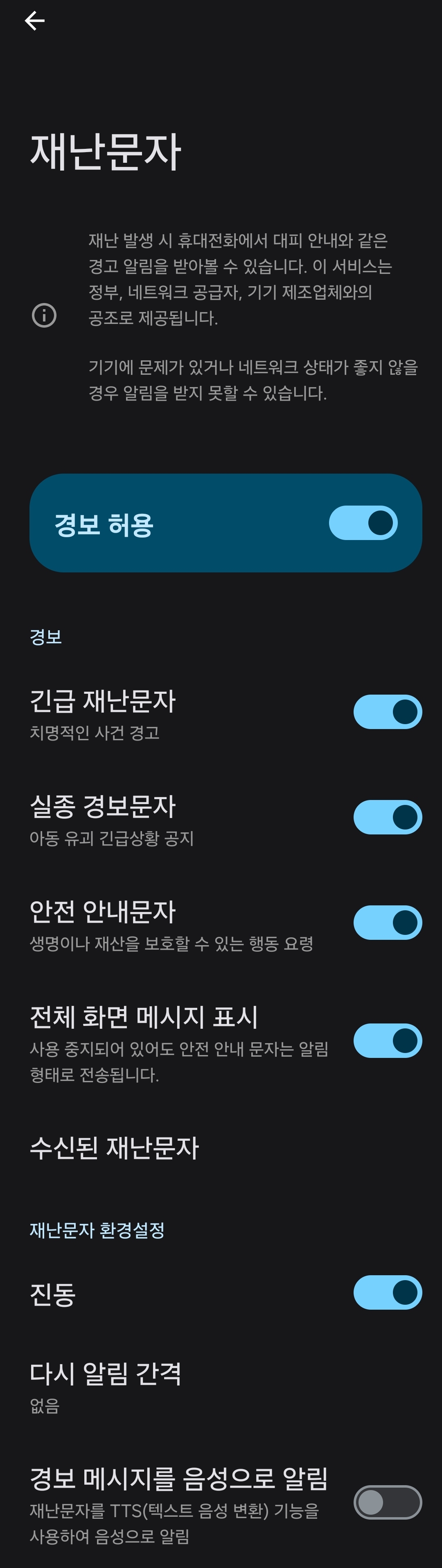 긴급 재난 문자는 원한다면 알림음과 진동을 끌 수 있습니다.
