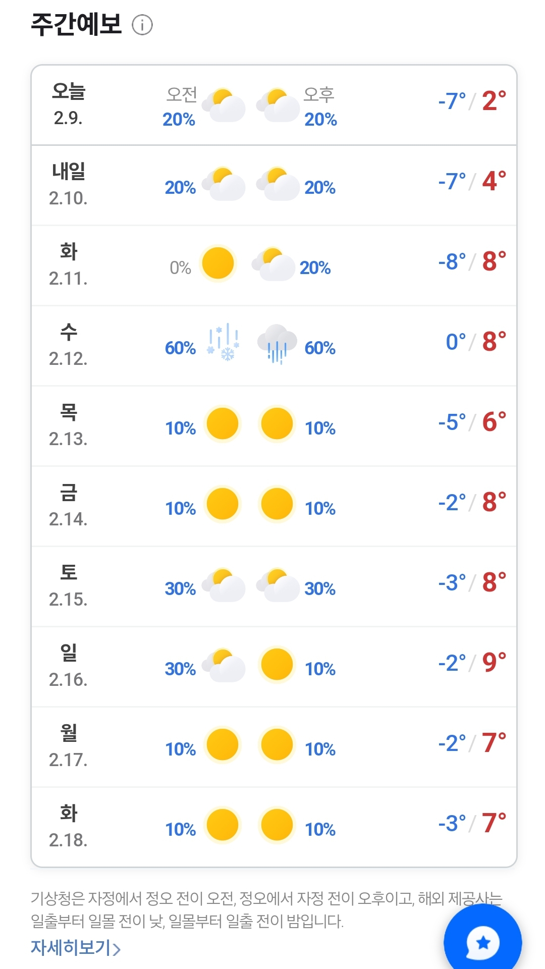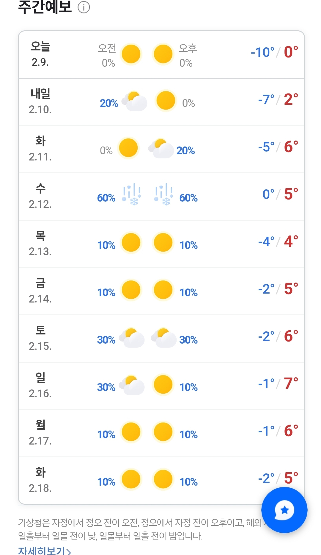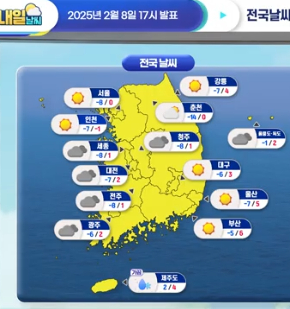 2025.2.9. 주간 일기예보. 오늘까지 강추위, 내일부터 슬슬 날씨 풀려 본문