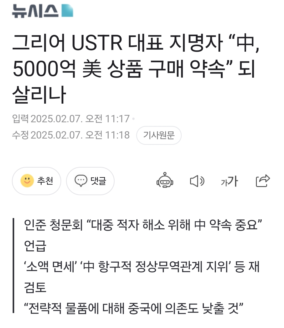 그리어 USTR 대표 지명자 “中, 5000억 美 상품 구매 약속” 되살리나