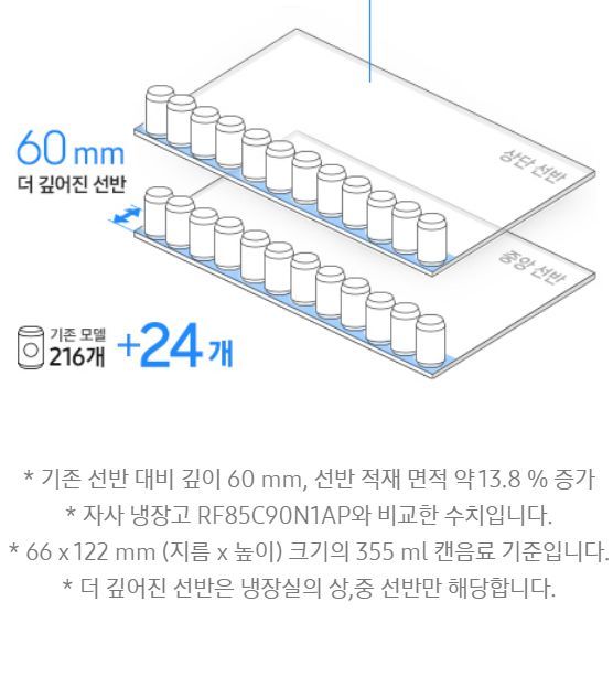 운반문제, 거치문제로 외형을 더 키우지는 못하니까 그런지, 내부를 더 파서 더 넓게 만들었다고 설명하고 았습니다. 몇 년 전에는 비스포크만 도어까지 각지게 만들었는데, 나중에는 일반모델도 도어를 각지게 만들어 도어쪽 용량을 키웠죠. 이번에는 내부 진열장의 뒤편으로 더 들어가게 했다고 합니다.
