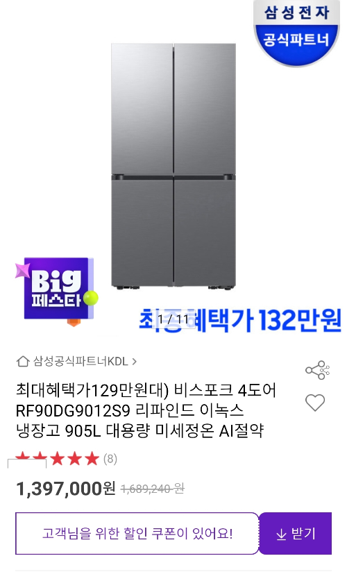 옥션) 삼성전자 비스포크 4도어 RF90DG9012S9 냉장고 905L (129~139만원대) 본문