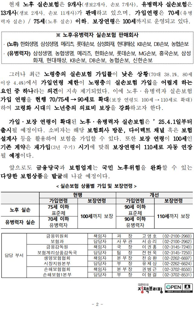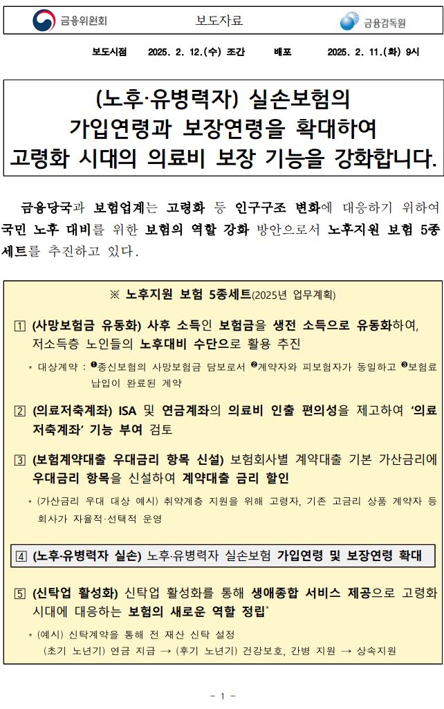 (노후·유병력자) 실손보험의가입연령과 보장연령을 확대하여 고령화 시대의 의료비 보장 기능을 강화합니다. - 금융위원회 2025.1.11.배포